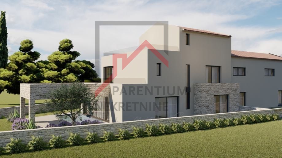 Das Grundstück liegt am Rande des Baugebiets und bietet einen unverbauten Blick auf landwirtschaftliche Flächen. Der Blick reicht bis zu den Bergen Učka und Ćićarija.