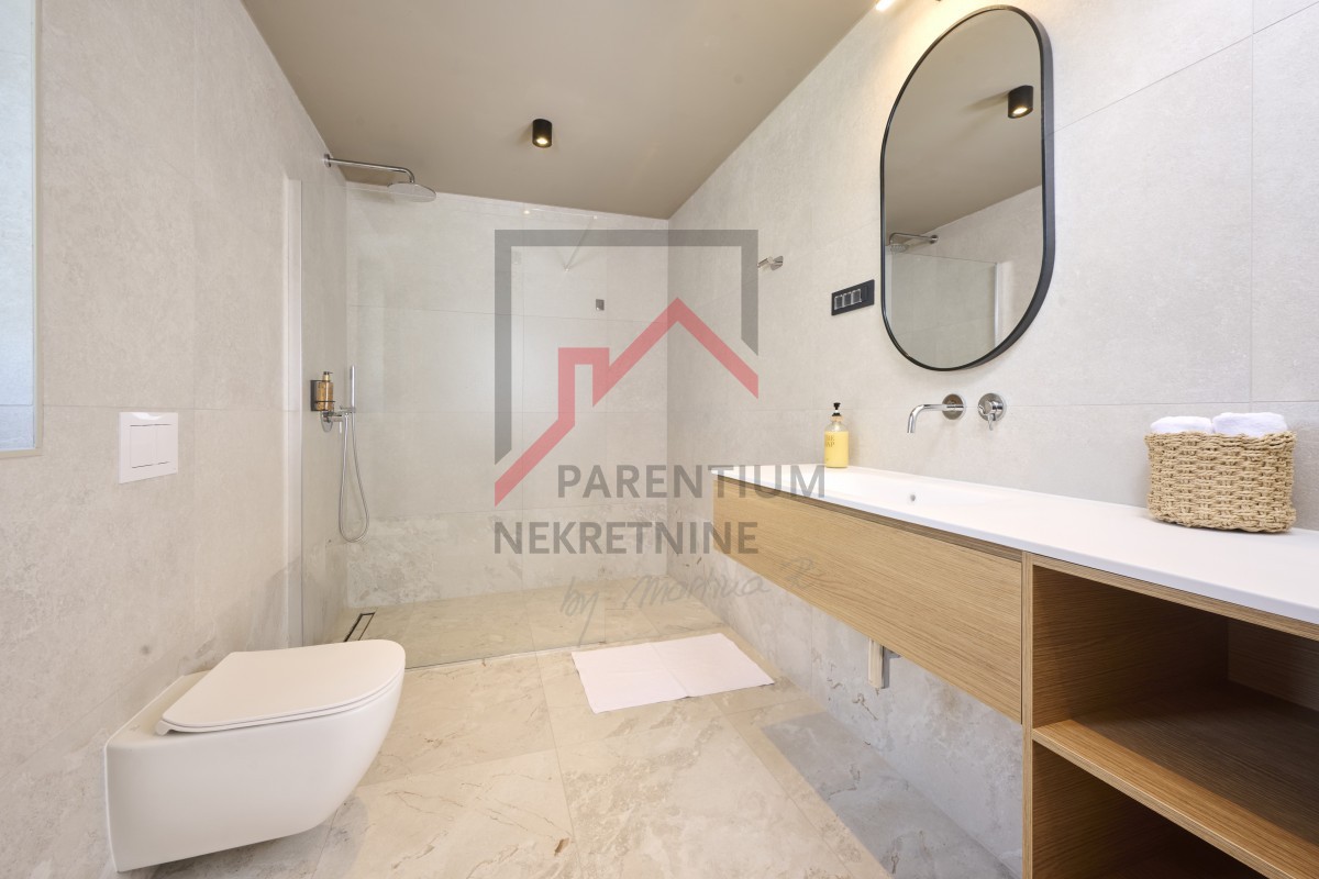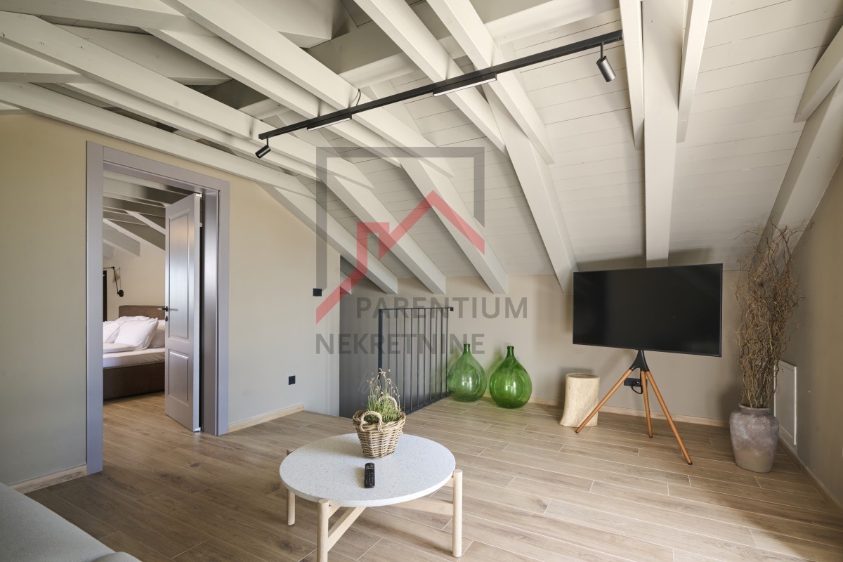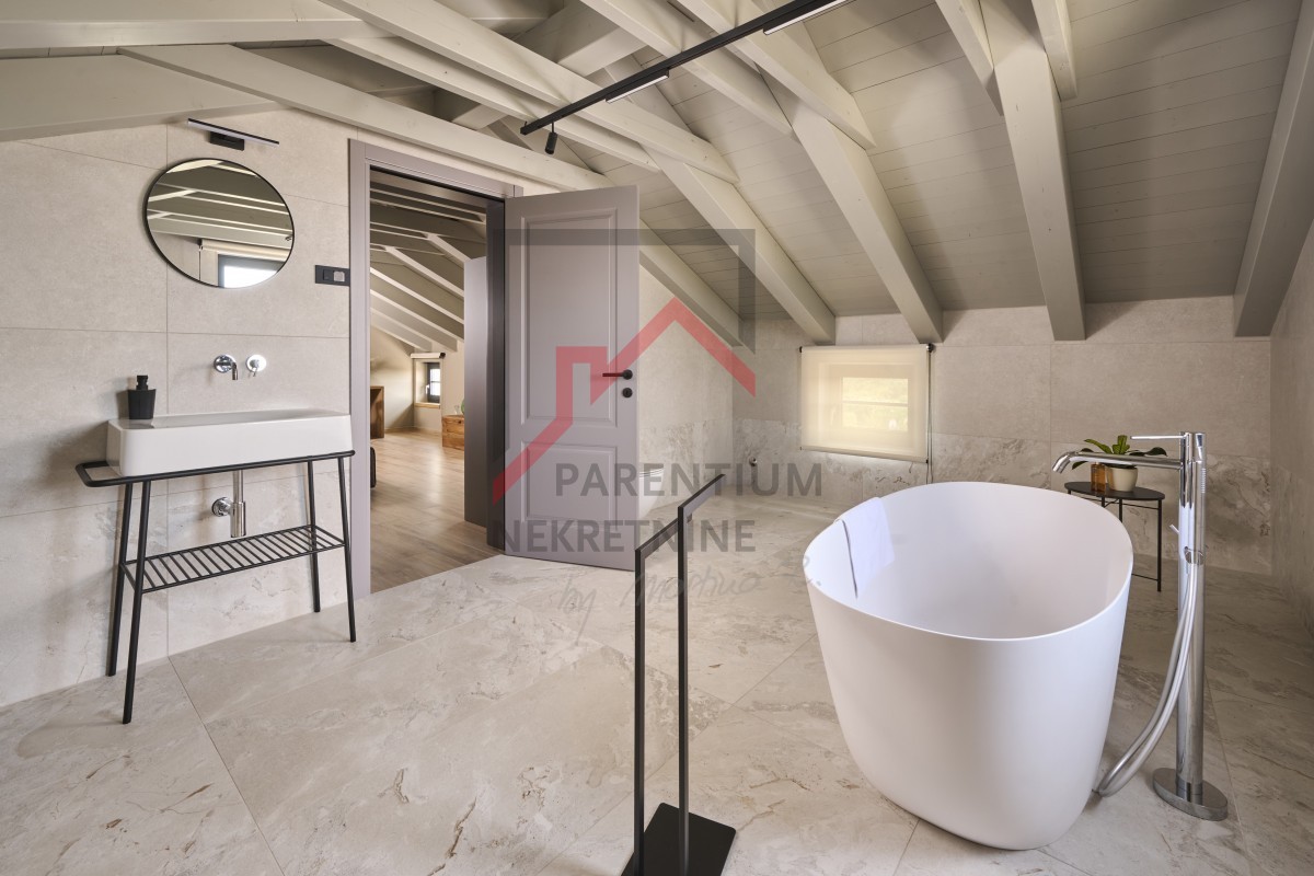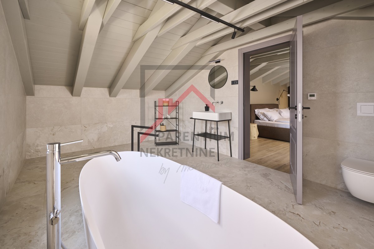 U potkrovlju, površine 96m2, nalazi se još jedna spavaća soba sa kupatilom, TV room i izlaz na krovnu terasu otvorenim pogledom na more.