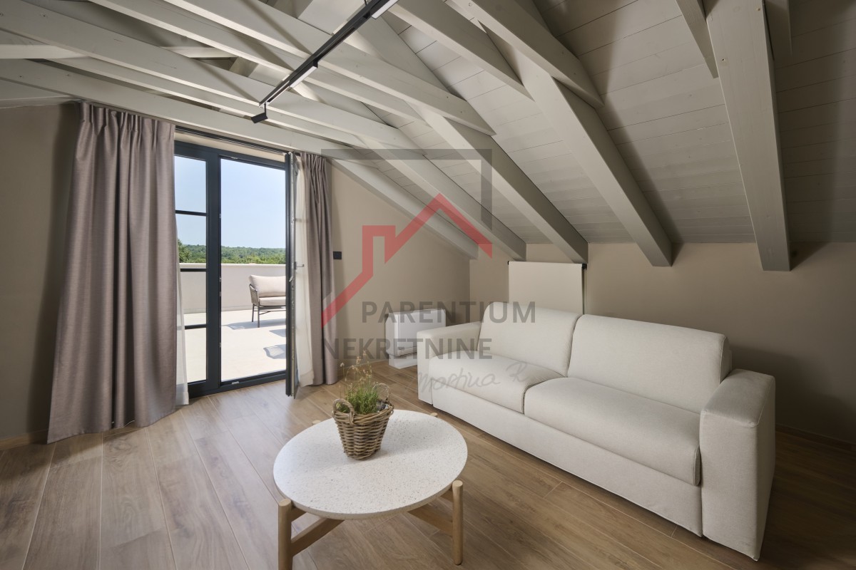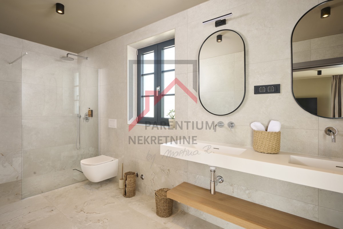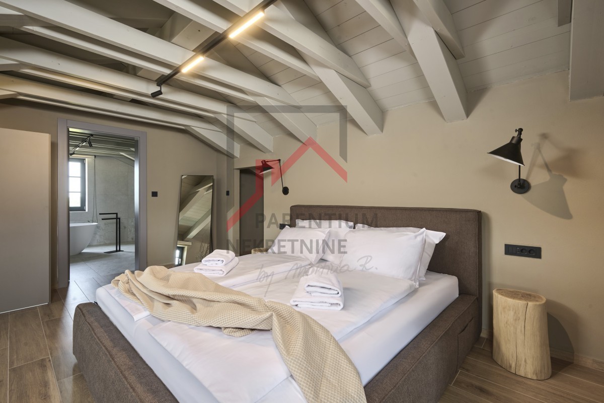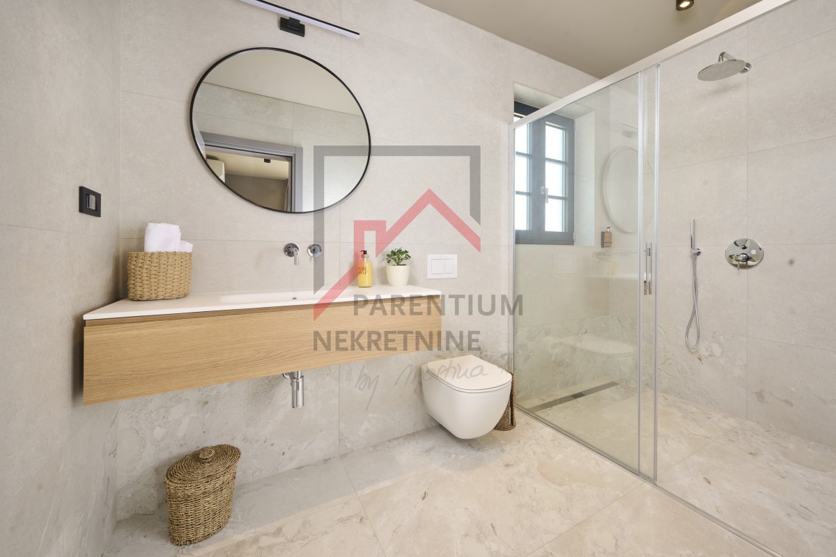 U potkrovlju, površine 96m2, nalazi se još jedna spavaća soba sa kupatilom, TV room i izlaz na krovnu terasu otvorenim pogledom na more.